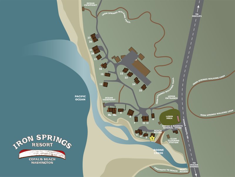 You’ll find Cabin #2 on the lower drive, beyond the registration office. This open floor plan cabin includes an abundance of windows for taking in views of Boone Creek, Copalis Beach and the Pacific Ocean beyond. Comfortable for two, with space for four, it’s quite simply, lovely.